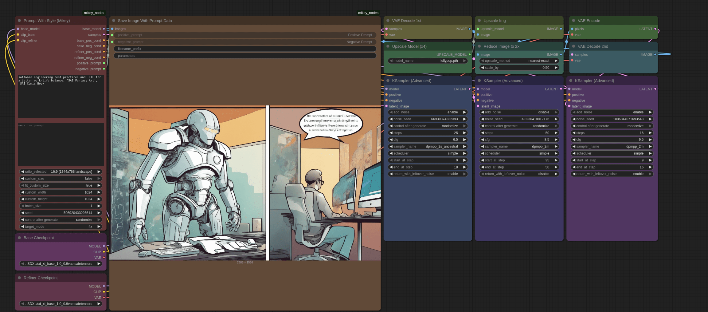 Now trying to recreate the art style i used in fooocs like SAI Fantasy Art, SAI Comic Book i looked around and Mikey Nodes seems to the most popular. After using the prompt_with_styles_2x.json from the repo seems be a starting place. Once i fixed the models.